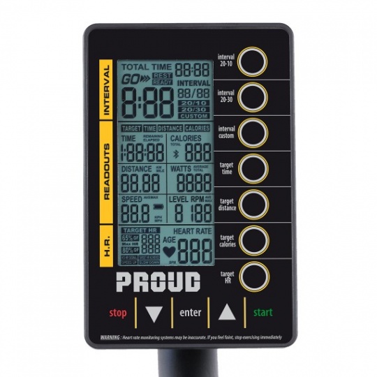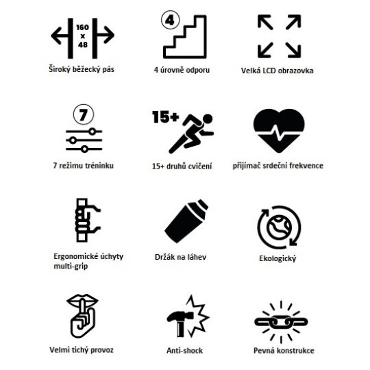 Ovládací panel 20 x 13 cm s čitelným displejem a pohodlnými velkými tlačítky zobrazuje všechny potřebné informace o rychlosti jízdy, chůzi a běhu, minulém čase, vzdálenosti, spálených kaloriích a pulsu a také vám umožňuje zvolit si jeden ze sedmi režimů tréninku.