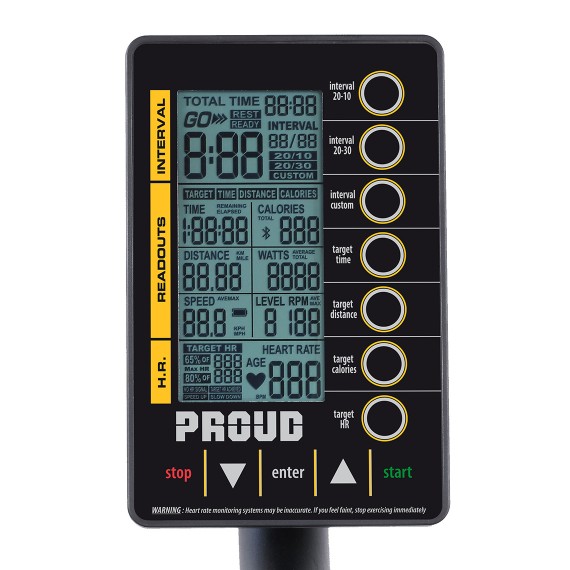 Ovládací panel 20 x 13 cm s čitelným displejem a pohodlnými velkými tlačítky zobrazuje všechny potřebné informace o rychlosti jízdy, chůzi a běhu, minulém čase, vzdálenosti, spálených kaloriích a pulsu a také vám umožňuje zvolit si jeden ze sedmi režimů tréninku.