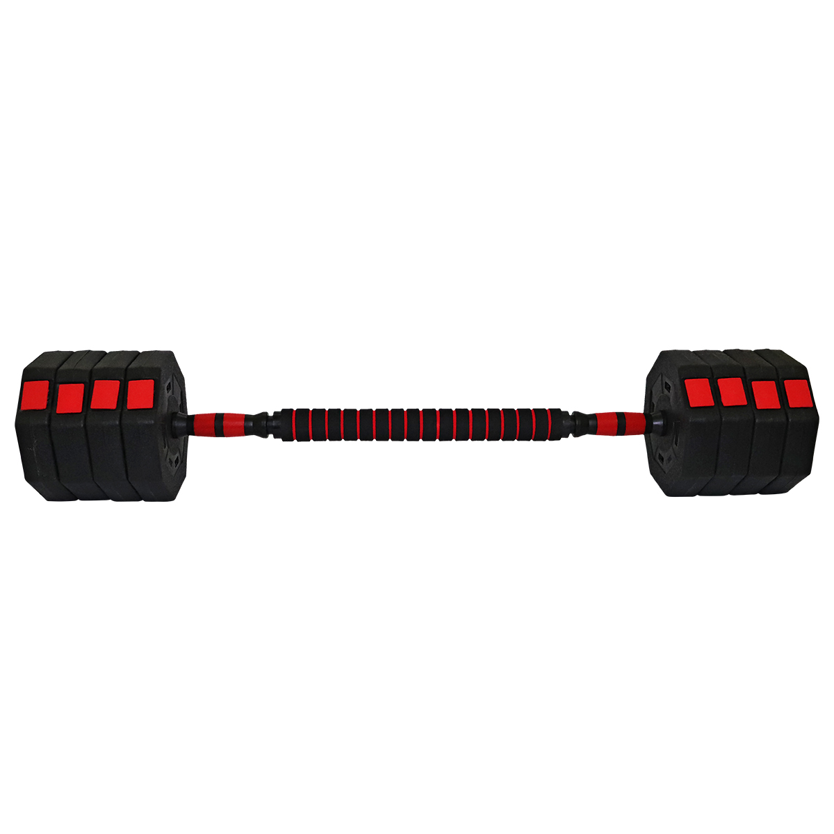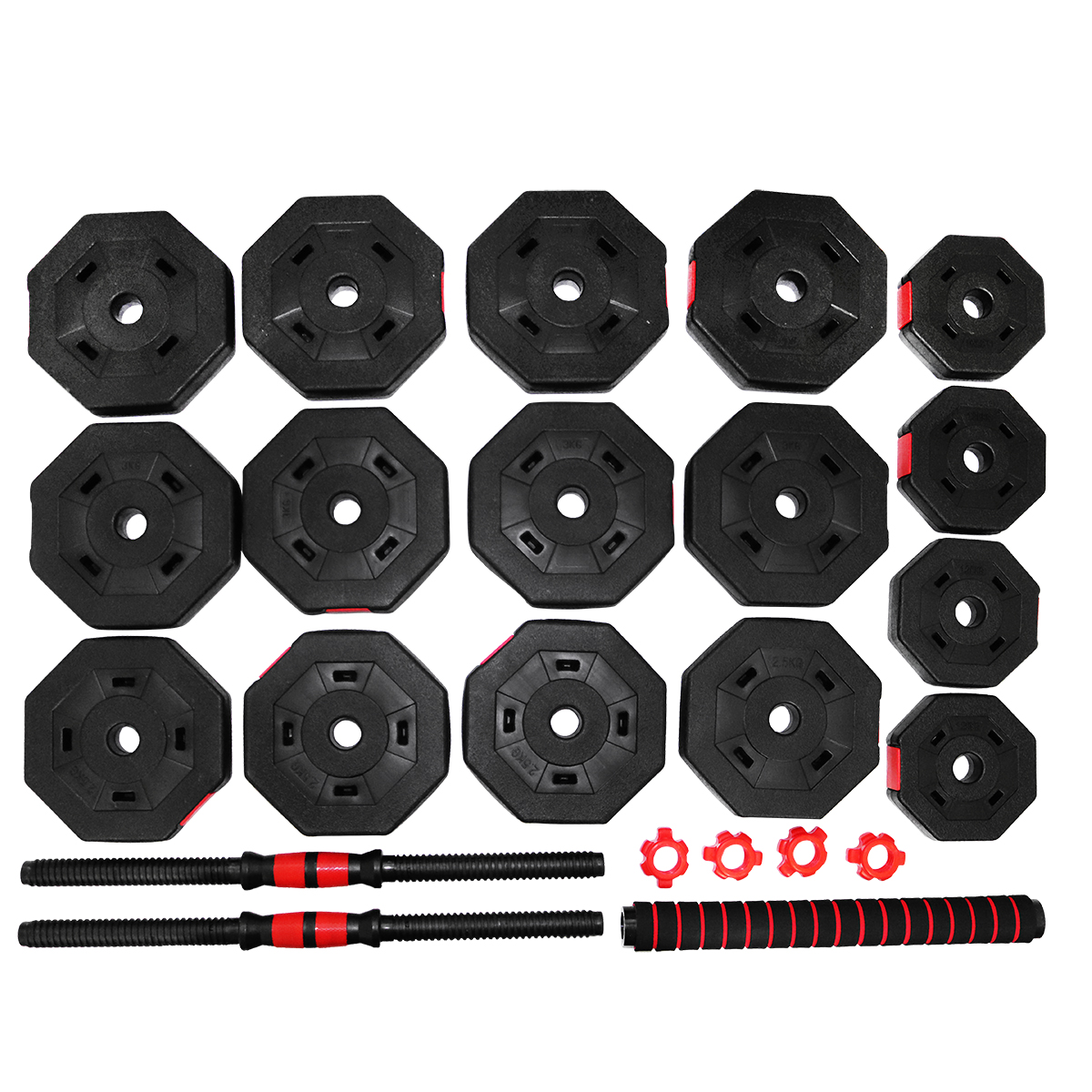 Set dvou jednoručních činek, ze kterých lze pomocí přídavného spojovacího dílu vytvořit jednu 40 kg obouruční činku.