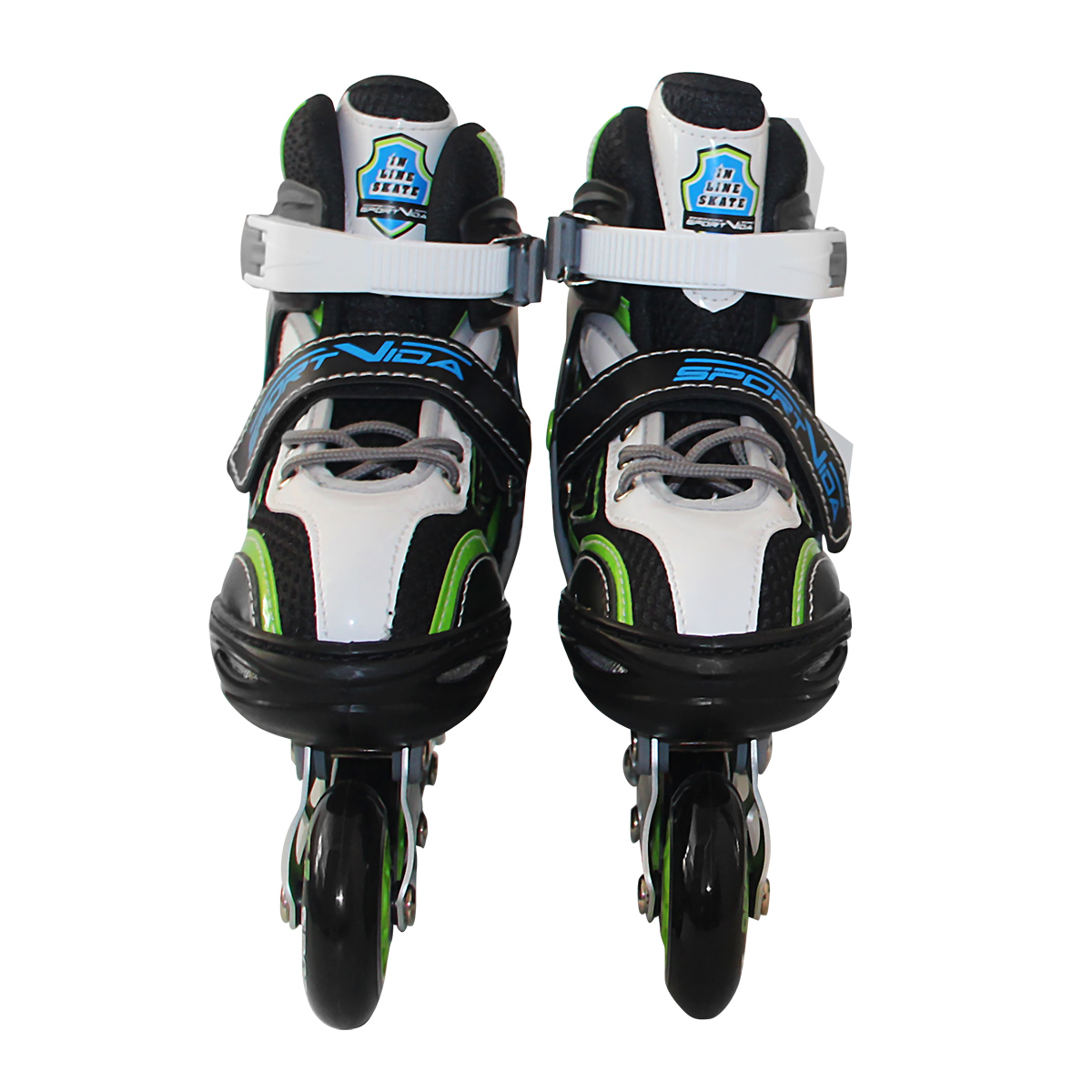 Nastavitelné kolečkové brusle značky Sportvida Kolečkové brusle mají čtyřstupňový systém nastavení velikosti boty, díky kterému tento model „poroste“ spolu s dětskou nohou. Model je vyroben z vysoce kvalitních materiálů (pevný hlinikový rám, ložiska Abec-7, pryžová kola), odvětrávaná bota s oky zajišťuje pohodlí při dlouhodobém používán