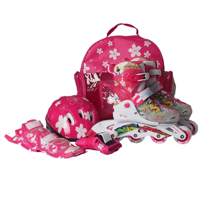 Sada kolečkových bruslí, chráničů, přilby a batohu Kiddy Mechanics Vám umožní jezdit aktivně a bezpečně. Jednoduché nastavení velikosti.