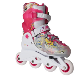Dětské kolečkové brusle jsou vybaveny 3 stupňovým zapínáním - přezkou, tkaničkami a suchým zipem. Vnitřní část je látka dodatečně vyztužená plastem, který nohy zpevňuje. Gumové kolečka. Ložiska ABEC-5.