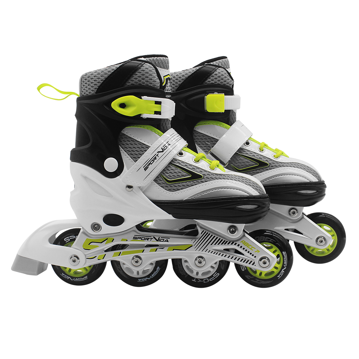 Nastavitelné kolečkové brusle značky Sportvida Kolečkové brusle mají čtyřstupňový systém nastavení velikosti boty, díky kterému tento model „poroste“ spolu s dětskou nohou. Model je vyroben z vysoce kvalitních materiálů (pevný hlinikový rám, ložiska Abec-7, pryžová kola), odvětrávaná bota s oky zajišťuje pohodlí při dlouhodobém používán