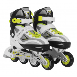 Model je vyroben z vysoce kvalitních materiálů (pevný hlinikový rám, ložiska Abec-7, pryžová kola), odvětrávaná bota s oky zajišťuje pohodlí při dlouhodobém používání, zatímco třístupňové zapínání (přezka, tkaničky a suchý zip) zajišťuje maximální bezpečnost během jízdy.