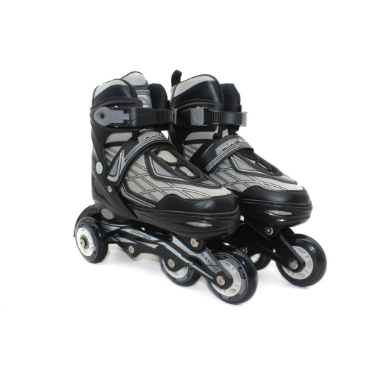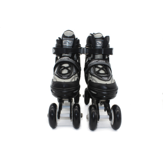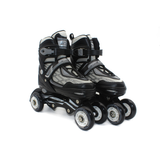 Kolečkové brusle s vyměnitelným zimním nožem a nastavitelnou velikostí. Ideální brusle pro celoroční využití. Zapínání na tkaničky, suchý zip a sponu zpevní kotník a zajistí pohodlnou jízdu. Hliníkový podvozek a kvalitní ložiska zaručují stabilitu. Z kolečkových bruslí lze výměnou koleček za nože udělat brusle lední. S těmito bruslemi si vychutnáte sportovní radovánky během letní i zimní sezóny.