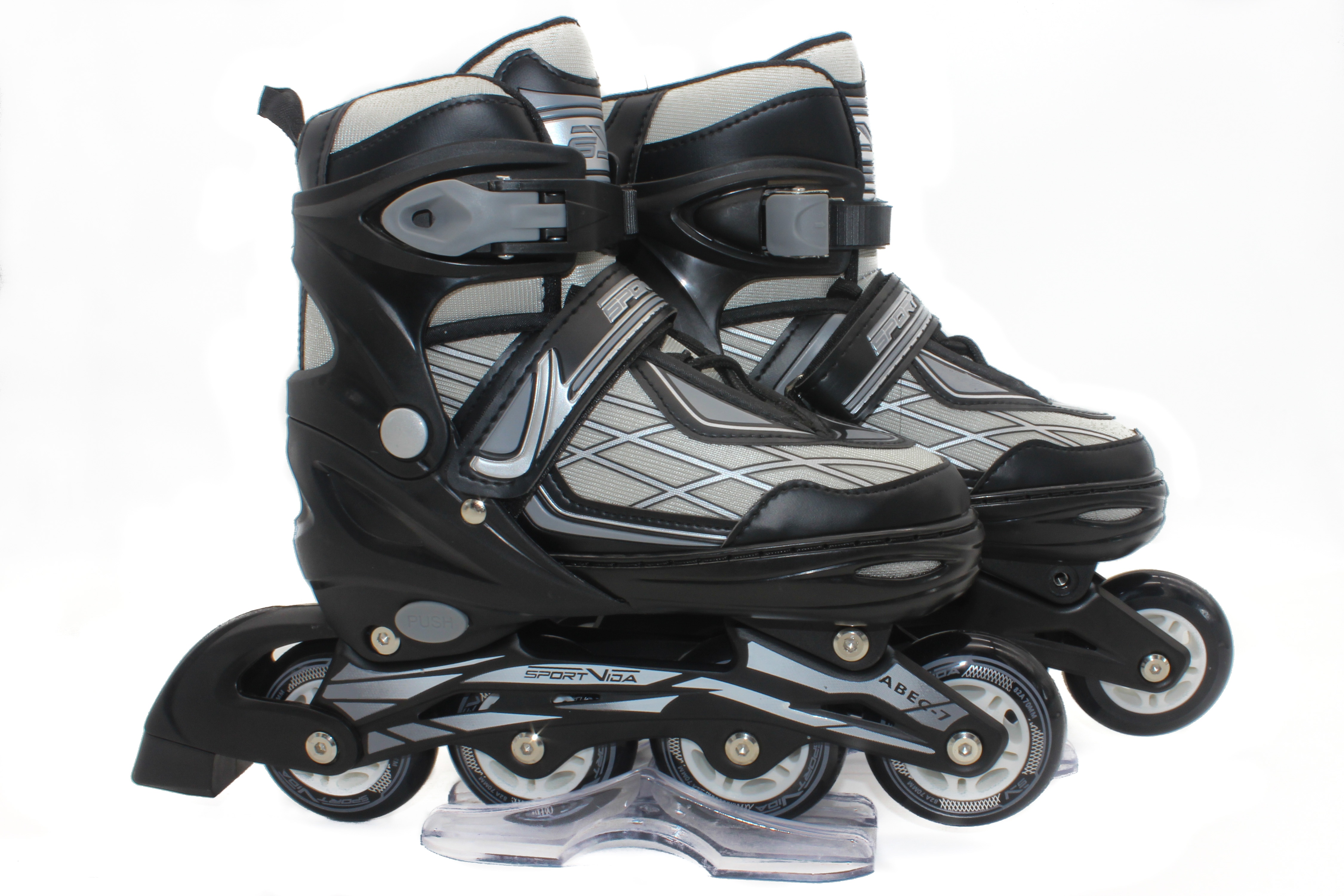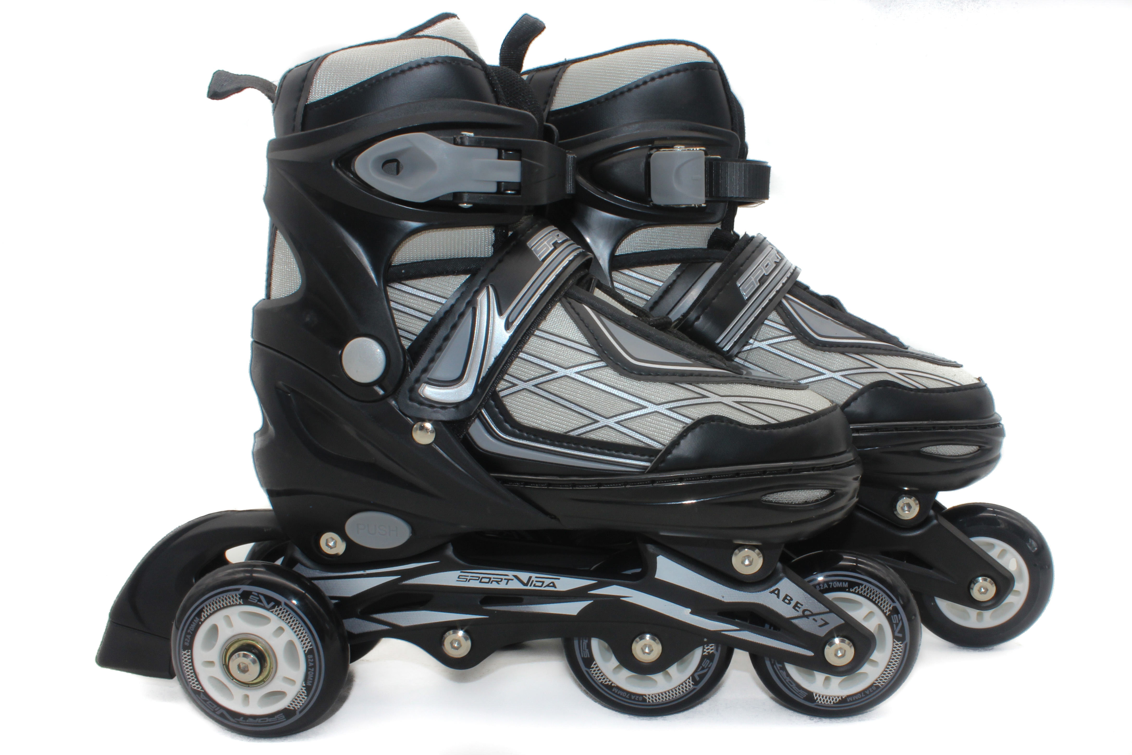 Nastavitelné kolečkové brusle značky Sportvida Kolečkové brusle mají čtyřstupňový systém nastavení velikosti boty, díky kterému tento model „poroste“ spolu s dětskou nohou. Model je vyroben z vysoce kvalitních materiálů (pevný hlinikový rám, ložiska Abec-7, pryžová kola), odvětrávaná bota s oky zajišťuje pohodlí při dlouhodobém používán