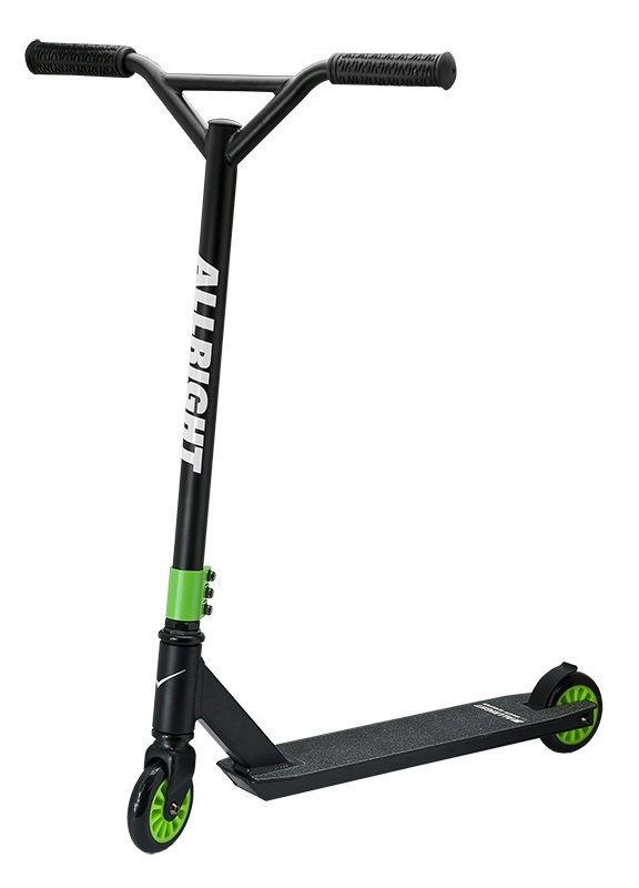 Allright freestylová koloběžka je vyrobena z nejkvalitnějšího hliníku. Kola jsou vyrobená z vysoce kvalitního PU jsou namontována na vynikající ložiska ABEC-9. Protiskluzová plošina zajišťuje stabilní a bezpečnou jízdu. Pogumované rukojeti zaručují pevné uchopení při jízdě a provádění triků. Výhodou je také volant s 360 stupňovou rotací.