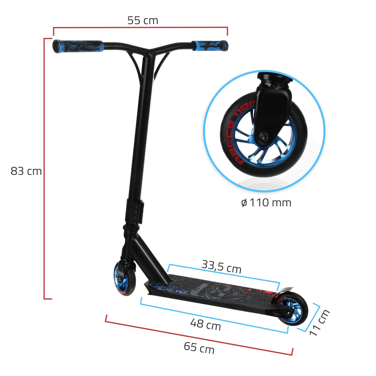 - Koloběžka má prodloužená řídítka (až 55 cm) - což rozšiřuje rozsah jejích možností při jízdě a provádění všech triků.