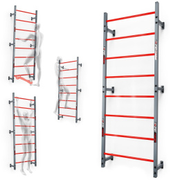 Bezpečnost cvičení vyžaduje připevnění žebříku ke stěně s 12 šrouby obsaženými v sadě. Žebřík je namontován až se šesti rukojeťmi, takže si můžete být jisti, že zařízení také vydrží dynamická cvičení.