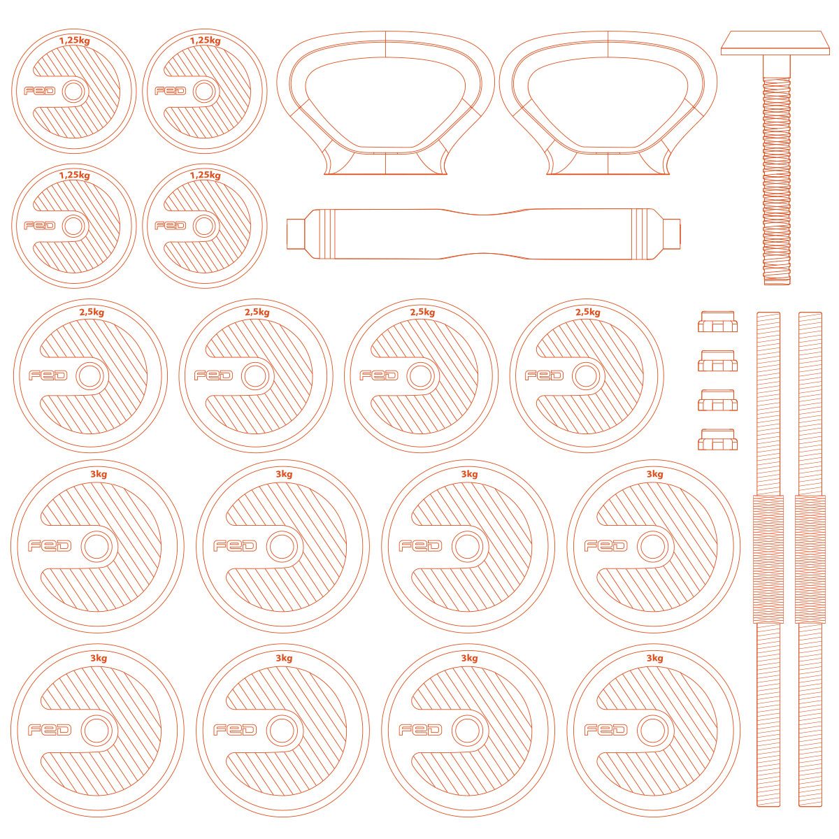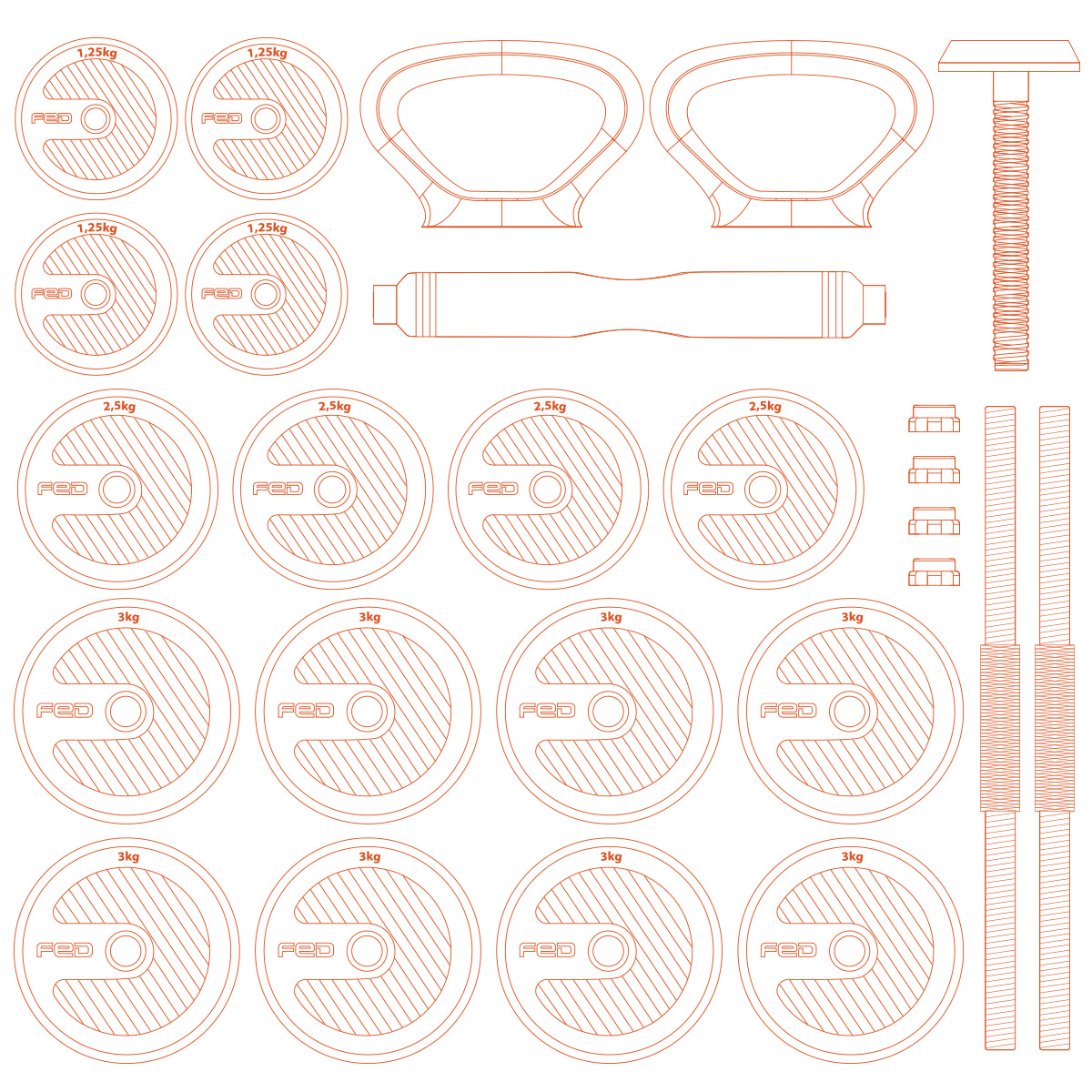 Sada 40 kg činek, ze kterých lze sestavit činku a kettlebell.