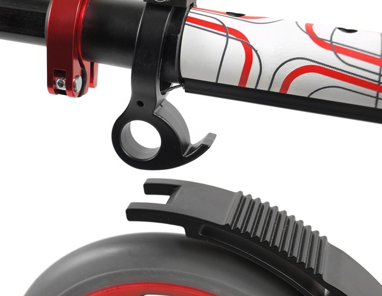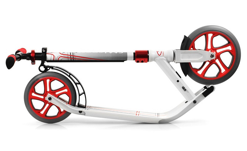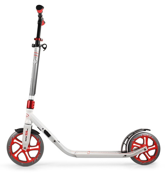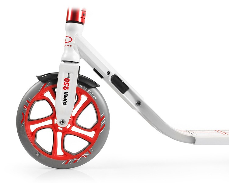 Díky nastavitelným řidítkům zaručuje možnost přizpůsobení koloběžky výšce uživatele. Velká kola 250 mm a 215,5 mm zaručují rychlejší a efektivnější jízdu, snižují náraz.