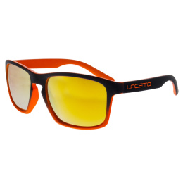 Černé sluneční brýle značky Laceto LUCIO s oranžovými detaily, vhodné pro běžné nošení. Jejich skla jsou oranžová REVO. Kategorie podle stupně protisluneční ochrany je na třetí úrovni a použité filtry jsou 100? UVA,UVB a UVC.