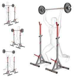 Stojany mají sedmistupňové nastavení výšky, zámkové otvory byly umístěny v intervalech 10 cm, což dává možnost přesného nastavení zařízení do jeho výšky. Při nastavení do správné výšky bude stojan zajištěn tlakovým šroubem a uzamykací tyčí – dvojitá záruka bezpečnosti během tréninku. Použili jsme vyhlazovací materiál, který je určen nejen k ztlumení odložení činky, ale také zabraňuje jeho kreslení.