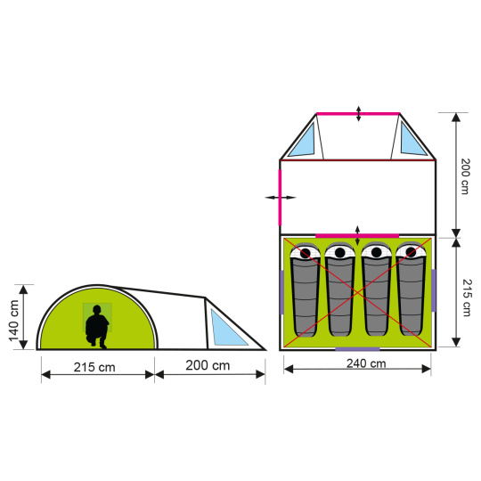 Stan má prostornou ložnici, kde mohou pohodlně odpočívat 4 dospělí. Velké předsíň může posloužit jako úschovna zavazadel nebo jako místo pro trávení volného času či stravování. Stan má lehkou konstrukci, takže jej rychle rozložíte na jakémkoliv terénu. Použitím kolíků a šňůry zajistíte stabilitu stanu a odolnost vůči větru. Stan má 3 okna, která lze kdykoliv zakrýt roletami. 2 vstupy do stanu zvyšují komfort používání. V ložnici jsou 2 kapsy na drobnosti a věšák na lampu.