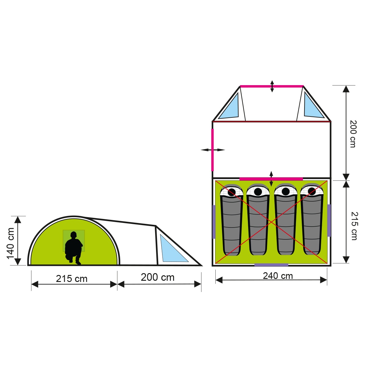 Stan má prostornou ložnici, kde mohou pohodlně odpočívat 4 dospělí. Velké předsíň může posloužit jako úschovna zavazadel nebo jako místo pro trávení volného času či stravování. Stan má lehkou konstrukci, takže jej rychle rozložíte na jakémkoliv terénu. Použitím kolíků a šňůry zajistíte stabilitu stanu a odolnost vůči větru. Stan má 3 okna, která lze kdykoliv zakrýt roletami. 2 vstupy do stanu zvyšují komfort používání. V ložnici jsou 2 kapsy na drobnosti a věšák na lampu.